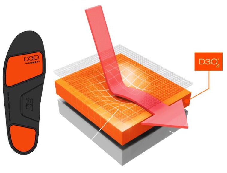 В средней части подошвы используется материал EVA для более эффективного педалирования. Стелька из D3O поглощает удары от педалей, а также делает более комфортные походы на длительные расстояния.