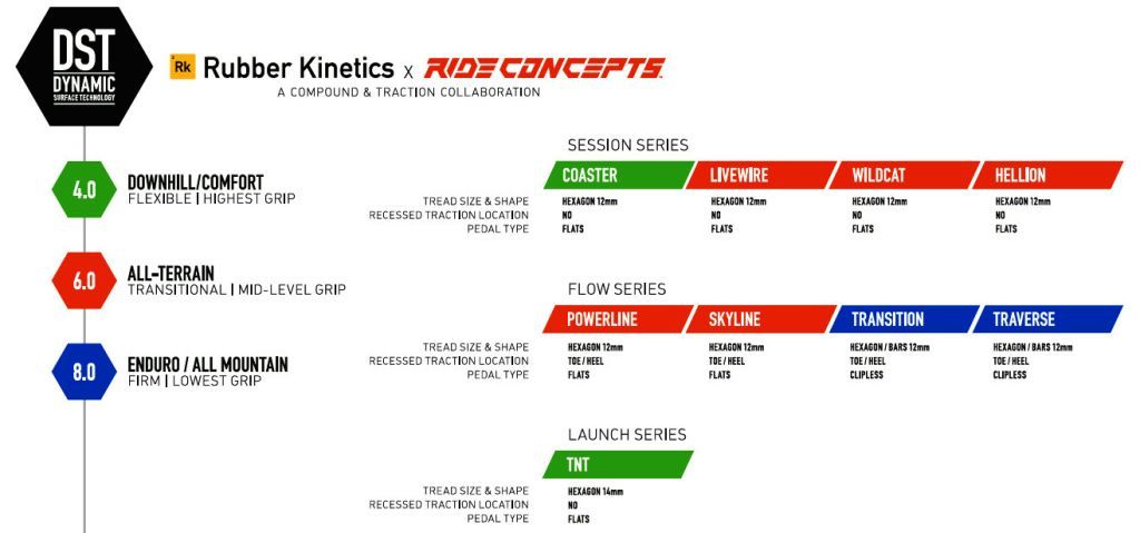- Rubber Kinetics: При разработке обуви MTB, которая не имеет себе равных ни в одной другой доступной коллекции, резиновая смесь и тяговое усилие имеют первостепенное значение. Имея многолетний опыт работы в сегментах велосипедов и силовых видов спорта, Rubber Kinetics сосредоточена на разработке технологий, специализирующихся на резиновых смесях и их реальных применениях. Ride Concepts и Rubber Kinetics работали вместе над созданием трех запатентованных резиновых смесей, каждый из которых превосходит качество и конструкцию, доступные в настоящее время. Эти соединения являются не только основой каждой обуви, но также формируют старт отношений, основанных на прогрессии. Это специальная технология динамических поверхностей Ride Concepts.